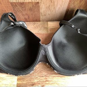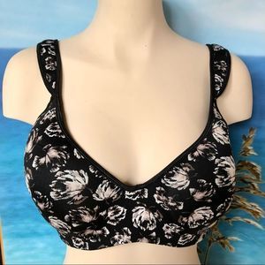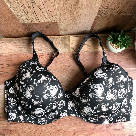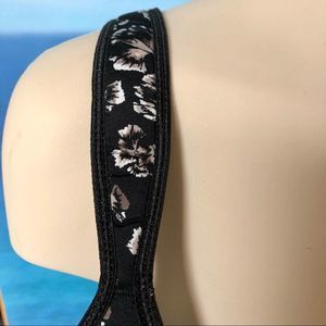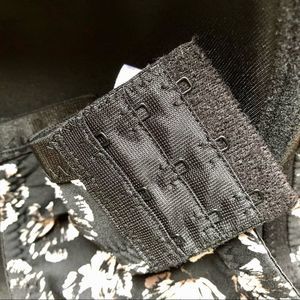 Black light lined bra with flowers with colours of beige white some brown and a hint of dusty rose. The straps are slightly padded to take pressure off the shoulders and the wider strap doesn’t dig in in EUC