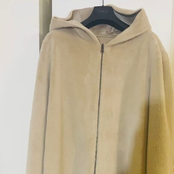 Adrienne Landau is a designer known for creating pieces with faux fur and luxe materials, including coats. The coat in the image is a long, hooded coat by the brand.