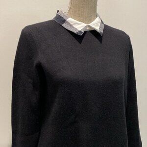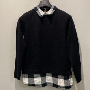 This is a black long-sleeved Adrienne Vittadini sweater with a white and black collared shirt underneath. The sweater is made of a soft knit material and has a relaxed fit. The shirt is a plaid pattern with black and white squares. The sweater has a round neckline and the shirt has a back eyelet button-up closure. The sweater is in excellent condition with no visible imperfections.