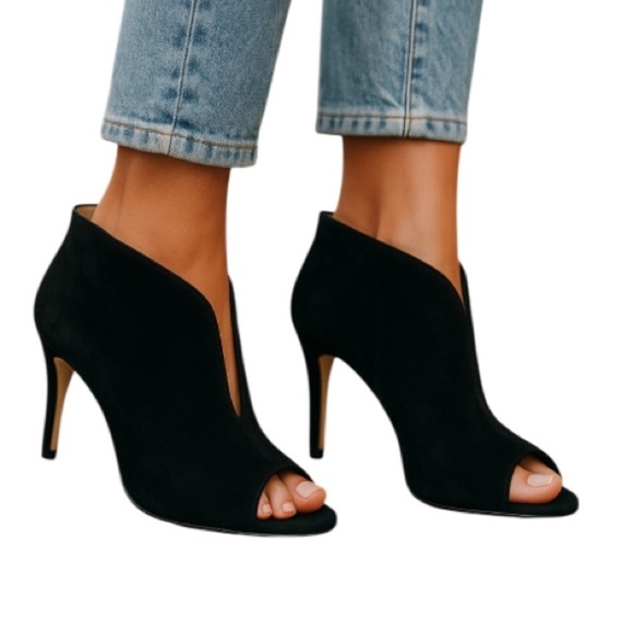 Adrienne Vittadini Peep Toe Split Vamp Heel Booties Black Fine Suede Leather 10