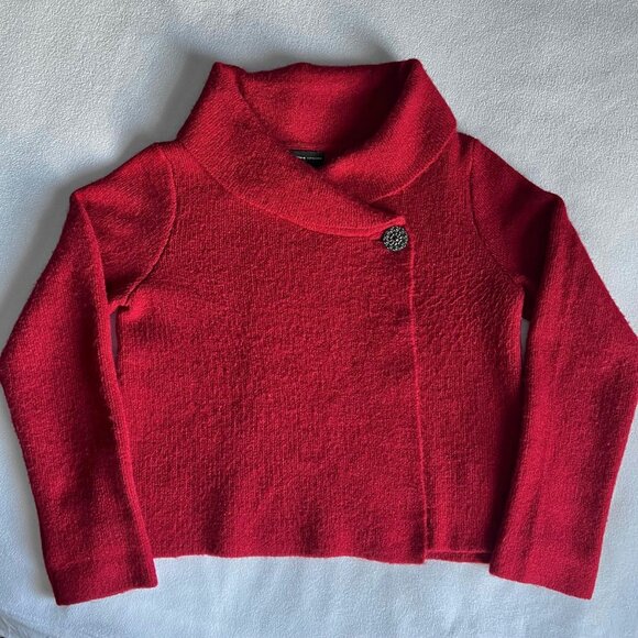 Gorgeous red sweater with cowl neck and asymmetric black button fasten. Brand: Adrienne Vittadin