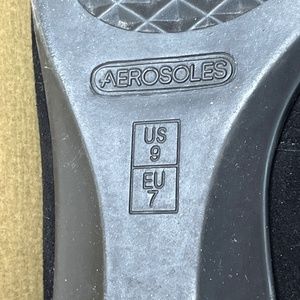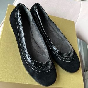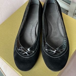 Aeorosoles 9M soft black flats, in suede with patent leather accents.