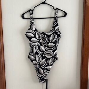 Stylish black and white patterned swimsuit. Features a unique design with button details.
