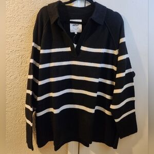 Stylish black and white striped sweater. Features a classic collar and relaxed fit. Perfect for casual wear.