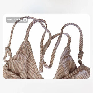 Burnt orange stripes on white, this boho style mini, features adjustable straps and is a cotton blend.