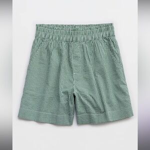 Embrace a classic summer look with Aerie's high waist shorts, featuring a charming green and white gingham pattern. Designed for comfort, these shorts boast a relaxed fit with an elastic waistband, making them perfect for warm weather outings. The lightweight fabric ensures breathability, while the rolled hem adds a touch of casual elegance to your everyday style.