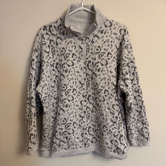 Stylish gray leopard print sweatshirt. Features a half-zip design. Comfortable and trendy.