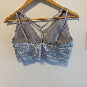 Silvery grey with a faint lavender shine. Lightly padded cups. Longline lace bralette with Y back.