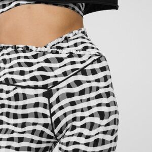These Aerie leggings feature a striking black, grey and white abstract wavy gingham pattern, offering a bold and modern look. Crafted from a stretchy fabric, they provide a comfortable and form-fitting silhouette perfect for casual outings or athletic activities.