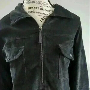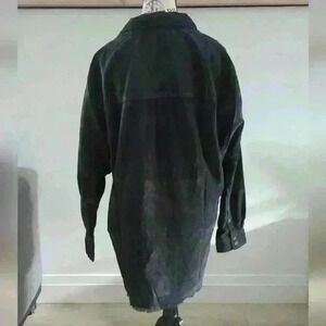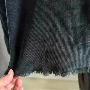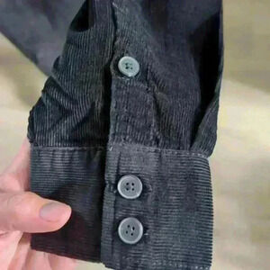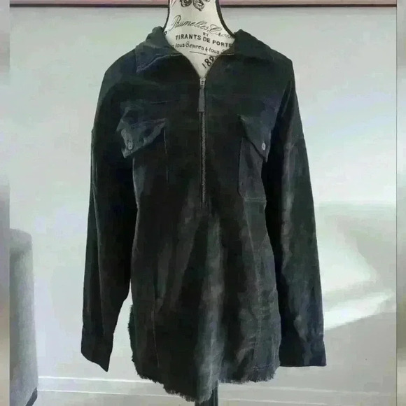 • Style: Henley style zip up, soft corduroy, button up cuffs, collard, shorter in the front, longer in the back, oversized (can comfortably fit up to a large)