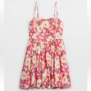 This sleeveless mini sundress by Aerie features a vibrant pink and orange floral pattern, perfect for casual resort wear. The spaghetti straps and flowy A-line silhouette offer a breezy, comfortable fit ideal for warm weather adventures.