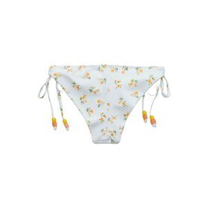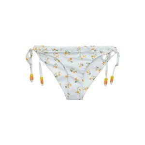 Aerie printed ruffle tie cheekier bikini bottom is an adorable choice for a vibrant and girly string bikini for the summer. This bikini is made with 80% recycled nylon, so you’ll be doing good while looking good! The string bikini is printed with yellow followers over a white backdrop. Match it with the aerie printed ruffle triangle bikini top for the perfect look.
