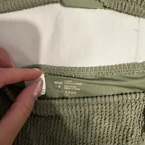 Glittery olive green colour. Size medium top and bottom. Super flattering and cute!