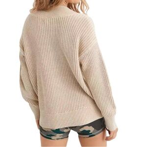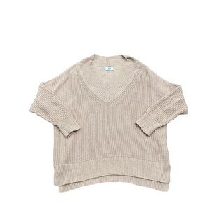 Stay cozy and stylish with this Aerie Ribbed Knit V-Neck Pullover Sweater. Featuring a chunky knit texture, relaxed oversized fit, and deep V-neckline, this soft 100% cotton sweater is perfect for layering and everyday wear. The cream/light pink hue adds a touch of warmth and versatility to your wardrobe.