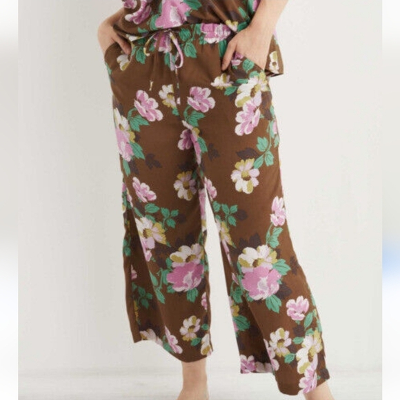 Aerie Wide Leg Cropped Pants Summer Brown Green Floral Womens Size Medium Boho