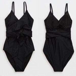 Aerie Wrap Full Coverage One Piece Swimsuit Black in very excellent pre worn condition. Like new. A stylish, eco‑friendly swim essential made with 80% recycled nylon. It offers full-coverage booty, adjustable straps, and removable pads for customizable support. Its flattering wrap design in classic True Black makes it both chic and comfortable. Please see all photos.