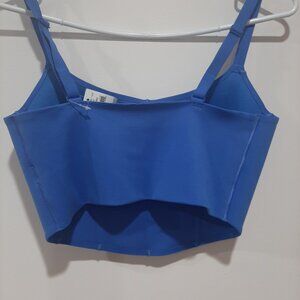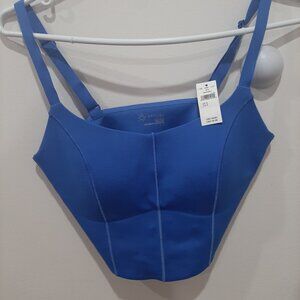 New with tags. Bought 3 colors and didn't end up wearing the blue. It has a very flattering corset style and it wireless, but still gives you a lot of shaping. Fabric is their real me line, which is known for being buttery soft, breathable and stretchy. These bras are so flattering on!