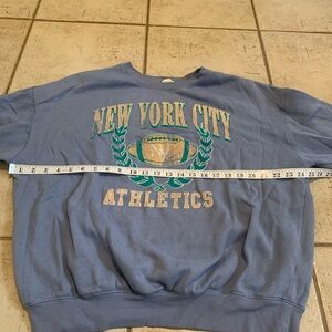 Get a vintage-inspired look with this Aero "New York City Athletics" sweatshirt. The soft, light blue crewneck features a classic collegiate-style graphic with a football and laurel wreath design. The lettering is in a tan/gold color with a distressed look. This cozy sweatshirt is perfect for a casual, sporty vibe.