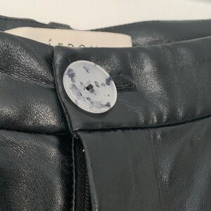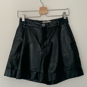 Aeron vegan leather high waisted shorts in black. Two-pocket styling, belt loops at waistband, pleated detailing at front, darting at back, rolled cuffs and zip-fly. Size tag is missing, but they are an extra small. Excellent used condition.