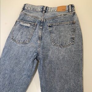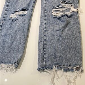 These 90’s high rise Straight cut jeans from Aeropostale feature a classic blue wash with stylish distressed details, including rips around the knees and a raw hem. The denim offers a comfortable fit with a lived-in look, perfect for adding a touch of casual flair to your wardrobe.
