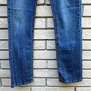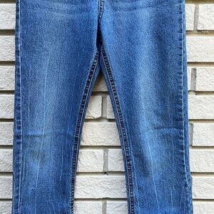 Classic denim styling, straight through leg, 5 pocket styling. Adjustable waistband. In good condition, no damage to note.