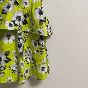 BNWOT green dress with black and white floral print. Strapless. Peplum and tiered.