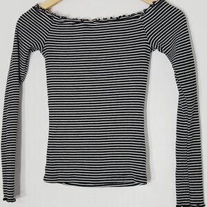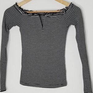 Aeropostale Striped Black White Cotton Spandex Ruffled Neck Long Sleeve Vintage Ribbed Y2K 90's 2000