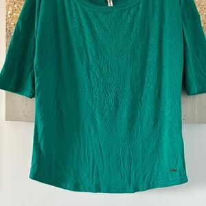 Size: Large. Color: Teal. 50% polyester; 50% rayon. Crew neck. Elbow-length sleeves. Soft, lightweight fabric.