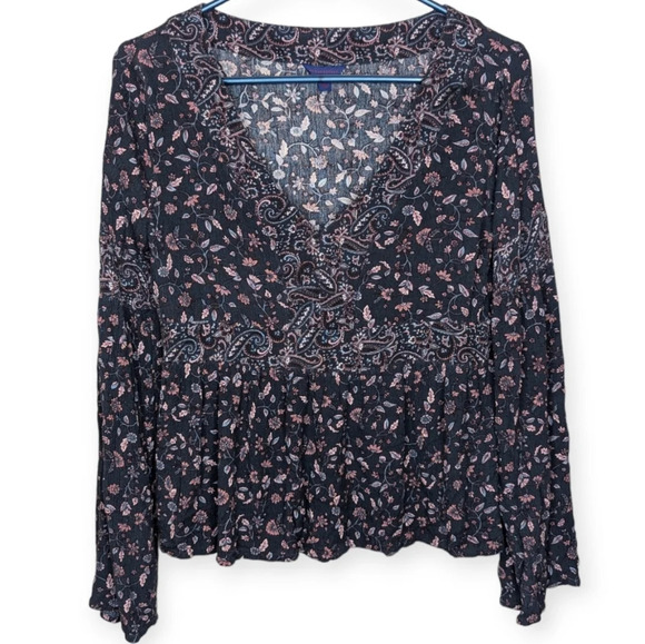 Aeropostale Y2K Navy Pink Floral Long Bell Sleeve Hippie Fit Flair V Neck Top M