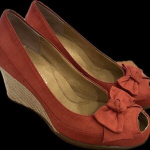 Step into comfort and charm with these Aerosoles “Well Wisher” wedges in size 7. Featuring a classic peep-toe opening and feminine bow detailing at the front, these shoes are both stylish and versatile.