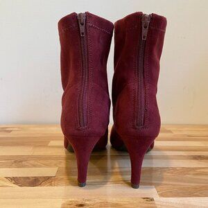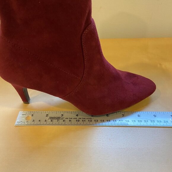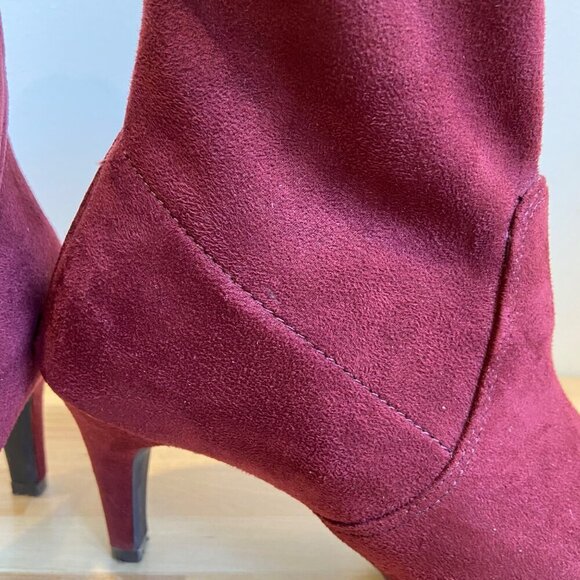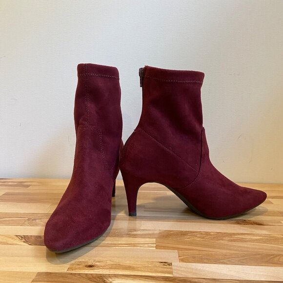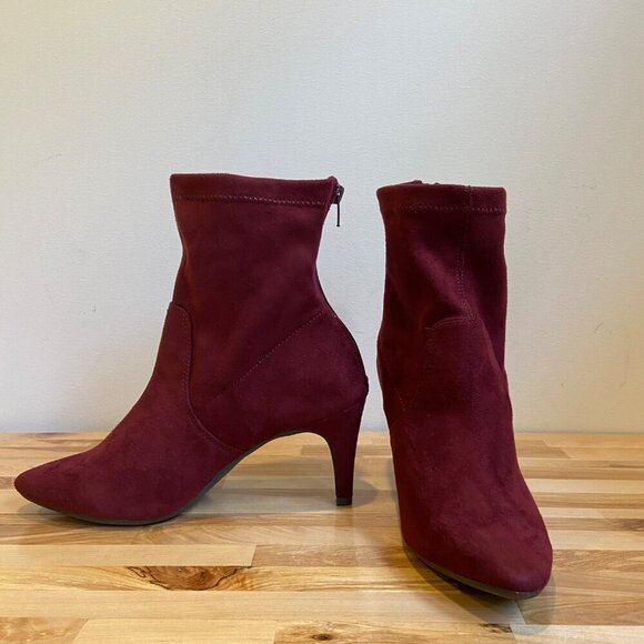Elegant and versatile, these Aerosoles women's low mid-calf heeled boots in burgundy faux stretchy suede offer a chic look. The back zipper ensures easy wear and secure fit.