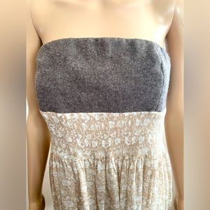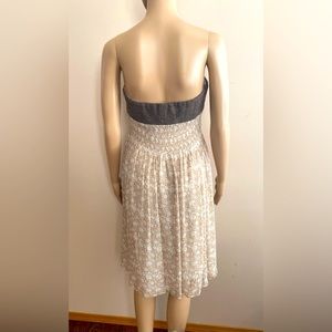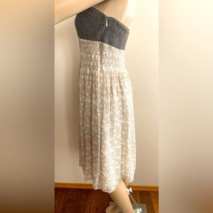 Tan Strapless Dress with White Floral Print. Tweed Upper. Side Zip with hook & eye. Fully Lined.