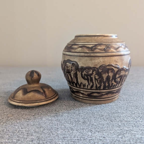 African Ceramic Pottery Jar/Cannister/Sugar Bowl with Elephants, Lid