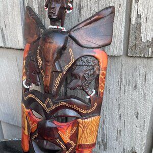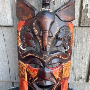 African Kenyan Tribal Multiple Face Mask with Elephant Hand Carved Wooden 10" length. Minimal wear, overall in great condition.