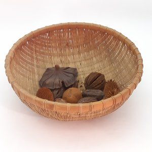 A wicker or rattan basket made in Africa that comes with a number of dried nuts, a mushroom and other pieces for display. The mushroom is quite fragile so please don't be surprised if it doesn't make it through shipping. I am ignorant of its exact origins or of what types of nuts/fungi the items are.
