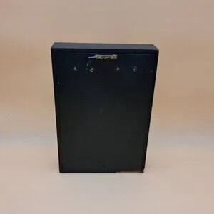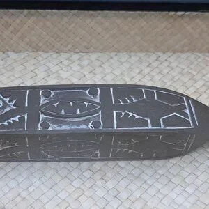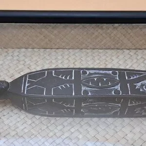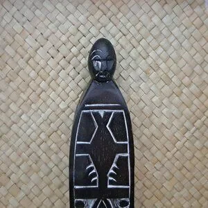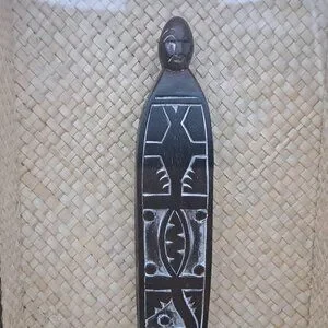 An African carving framed in a shadow box. The statue and frame are made of wood while the background is made of straw or wicker. The statue has white tinted carvings on it. The box is 12" tall, 2 3/8" deep and 8 1/4" wide. the statue within is roughly 7" tall by 1 3/4" in width.