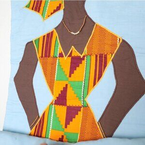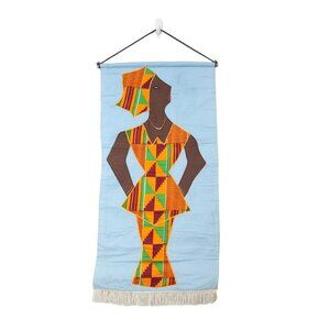 Adorn your space with the vibrant beauty of African culture with this stunning Wall Fabric Art Scroll Tapestry. This exquisite piece features a depiction of a woman from wearing a what I think may be a traditional Kente style dress and headwear, set against a dynamic backdrop of blue. Handcrafted with intricate details and rich colours, this tapestry is a true masterpiece that will add an exotic touch to any room. Hang it in your living room, bedroom, or office to create a unique and captivating focal point that will inspire awe and admiration.