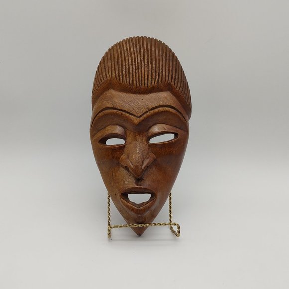 A wooden African tribal wall mask, exact origin unknown. The face has an open mouth and almost looks surprised. There is wear as in the pictures.