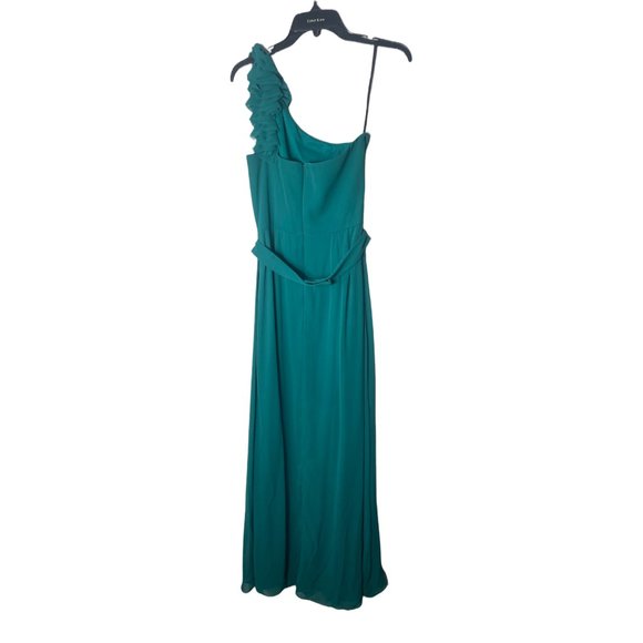 Full length one shoulder bridesmaid dress in lux chiffon fabric has shirred bodice and pretty flower detail at shoulder. Matching 1.5 inch belt at natural waist in lux chiffon over lining. Centre back zip.