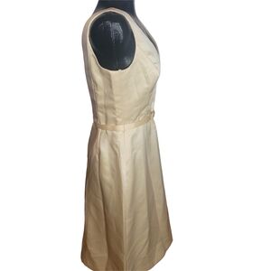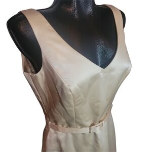 After Six satin formal occasion dress. Champagne colored with matching belt. Sleeveless designed with V neckline and back. Has a hidden back zipper closure.