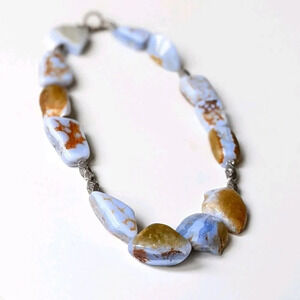 Features: Blue grey agate with shade of brown mounted on metal wire. Agates are known to have soothing properties.