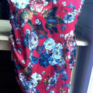Lovely top, only worn once. Recently laundered. multicolours with dominant colour being red. It feels like Satin but is actually 97 % polyester and 3 % spandex. Looks great with jeans, or dress it up. Great work top.