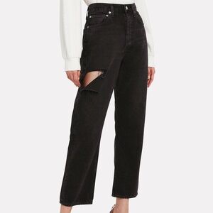 The label's 90's high-rise jeans in rigid Serpent wash denim showcase a boyfriend-inspired straight-leg cut with a rip on the right leg. Belt loops. Zip fly and button closure. Five pocket styling. Distressing throughout.
