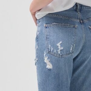 Looks Like: Medium, vintage indigo with destruction at knees and a finished, but distressed hem