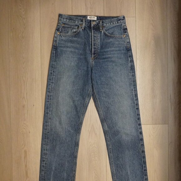 AGOLDE 90s Pinch Waist High Rise Straight Jeans in a medium blue wash color! Excellent condition, light distressing is part of the design, tiny mark as noted! Current style on website, one of their best sellers!! As seen on many bloggers and celebs!