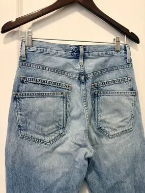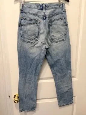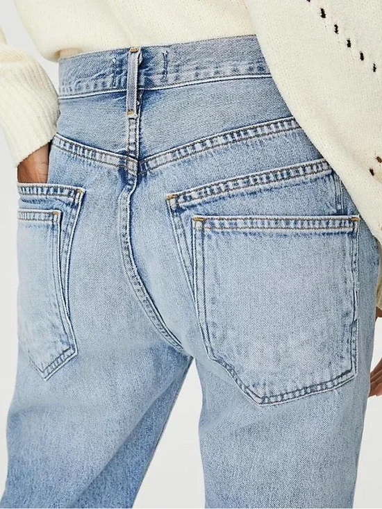 Classic light blue high-waist jeans with a relaxed straight fit. Durable denim with subtle vintage wash for everyday wear. Flattering back pocket placement and clean stitching detail. Easy to style for casual or dressed-up looks.