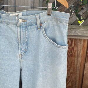 "These are low-rise jeans with a relaxed wide leg. They're cut from non-stretch 100% organic cotton denim. This version comes in a light-indigo wash with a finished hem."