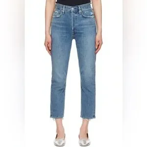 Slim-fit straight-leg non-stretch denim jeans. Fading, distressing, and whiskering throughout.