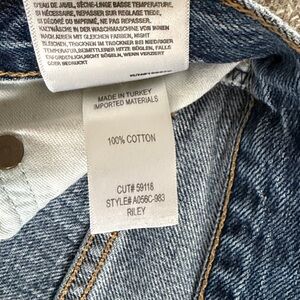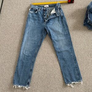 Agolde Riley jeans in sz 26. Straight - slim fit. EUC. Some natural distressing around hemlines. Wash is midblue, but darker than stock. 100% cotton, button fly. High waist. Inseam 25”