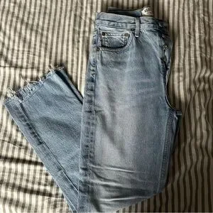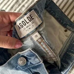 Experience timeless style with Agolde's blue straight leg jeans, featuring a classic light wash and a vintage-inspired look. The rigid denim fabric offers a structured fit, perfect for a casual, everyday ensemble.